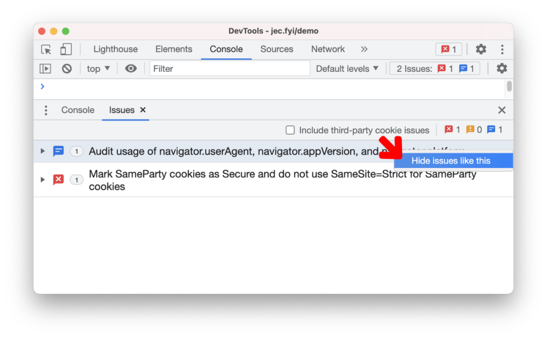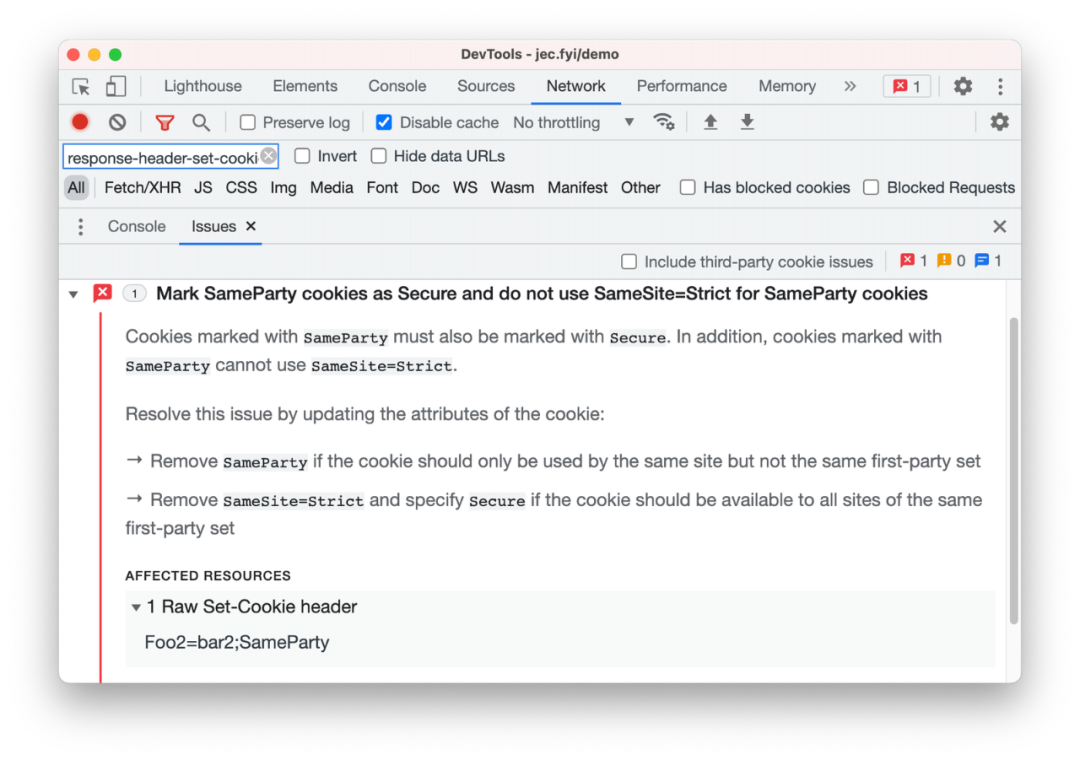 DevTools 现在可以在问题选项卡那里显示原生(raw) Set-Cookie 响应头(response headers)。