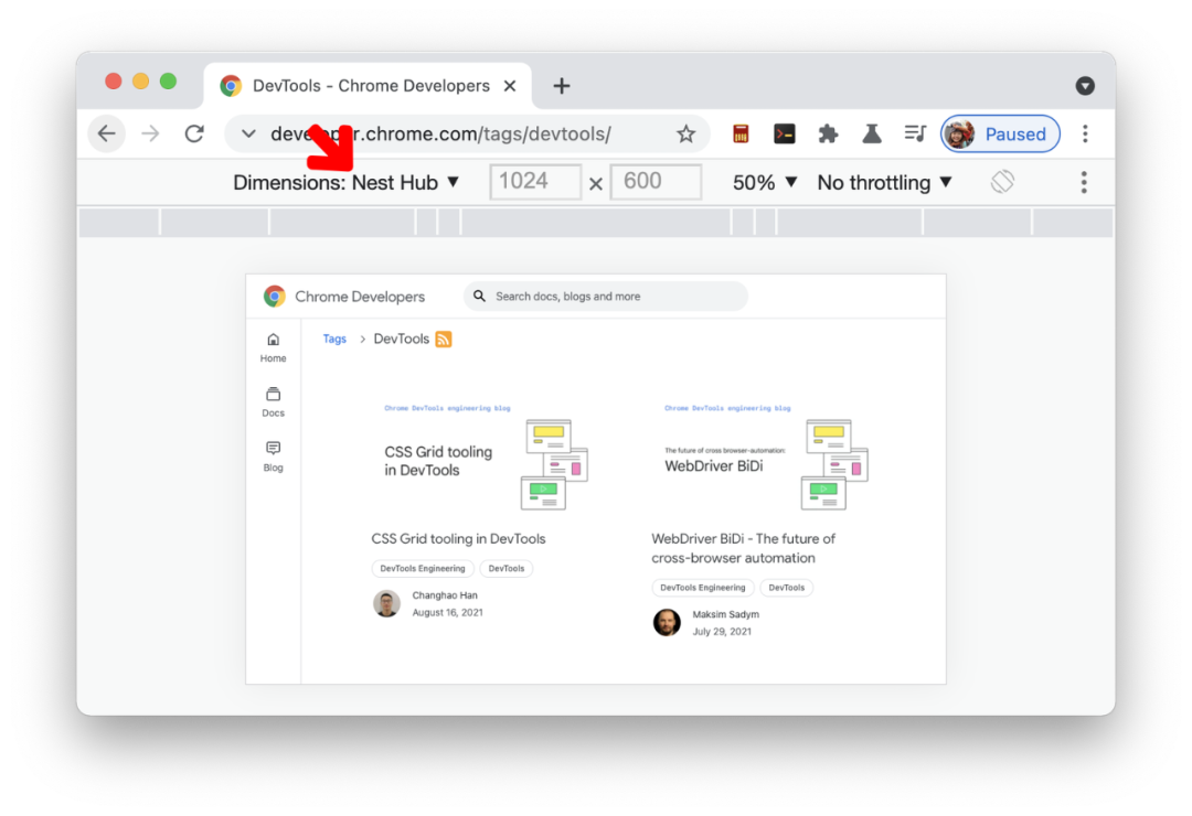 点击 切换设备工具栏图标,在设备列表里选择 Nest Hub 或者 Nest Hub Max 设备。