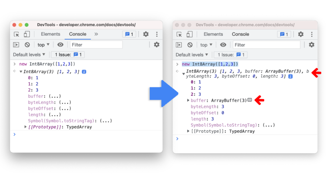 例如说,此前在控制台计算 new Int8Array([1, 2, 3]) 表达式时,原生访问器(如 length、byteOffset)并没有在预览中展示。经过这次更新,原生访问器会在预览中展示,并且在展开时会提前计算出结果。
