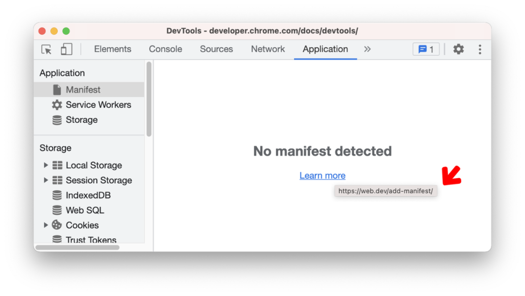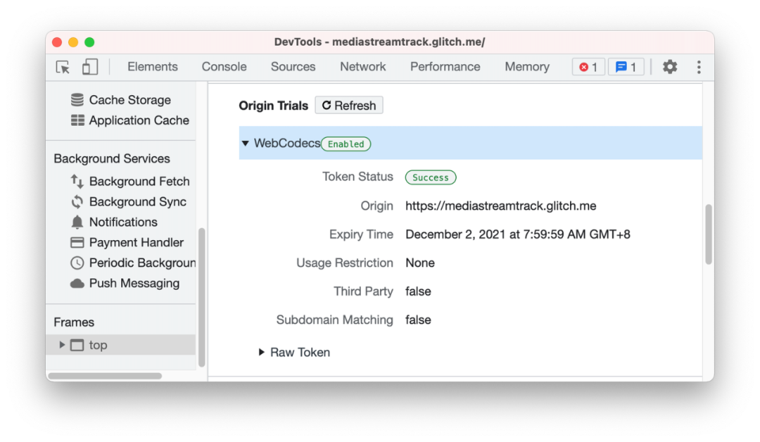 打开有注册参加 origin trials 的网页(参考 demo 页面)。在应用面板那里,滚动至帧区域,选中 top frame。