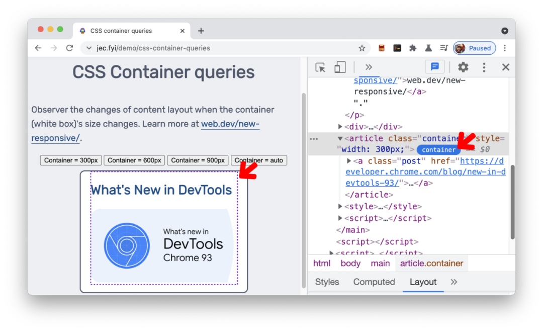 DevTools 在容器元素(Container elements,指的是那些匹配 @container @规则的祖先元素)的旁边,新增了容器徽章。点击该徽章,网页将突出显示选中容器元素,以及该容器所有的后代元素。