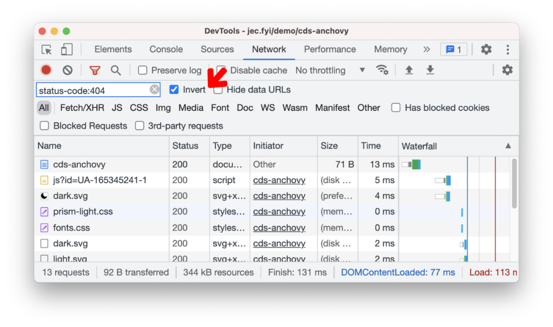 比如说,您可以在过滤文本框里输入 “status-code: 404” ,查看那些状态码为 404 的网络请求。点击反转复选框,可反转过滤条件(显示那些状态码为不是 404 的网络请求)。