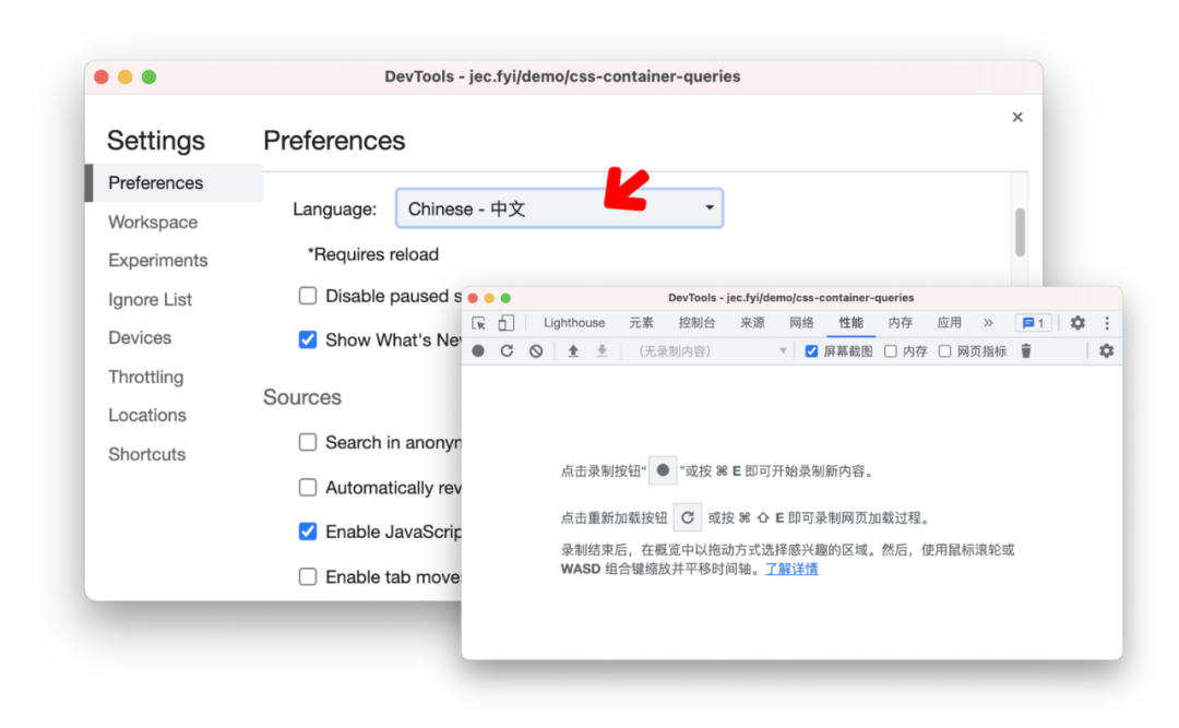 打开设置,然后点击偏好下的语言下拉菜单。选择自己喜欢的语言后,重新加载 DevTools。