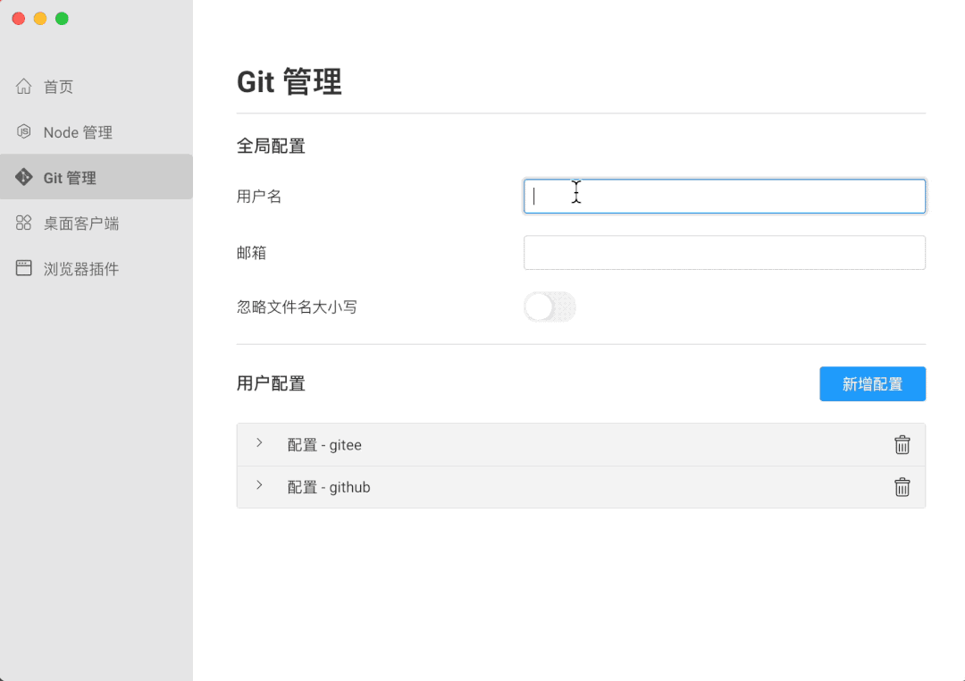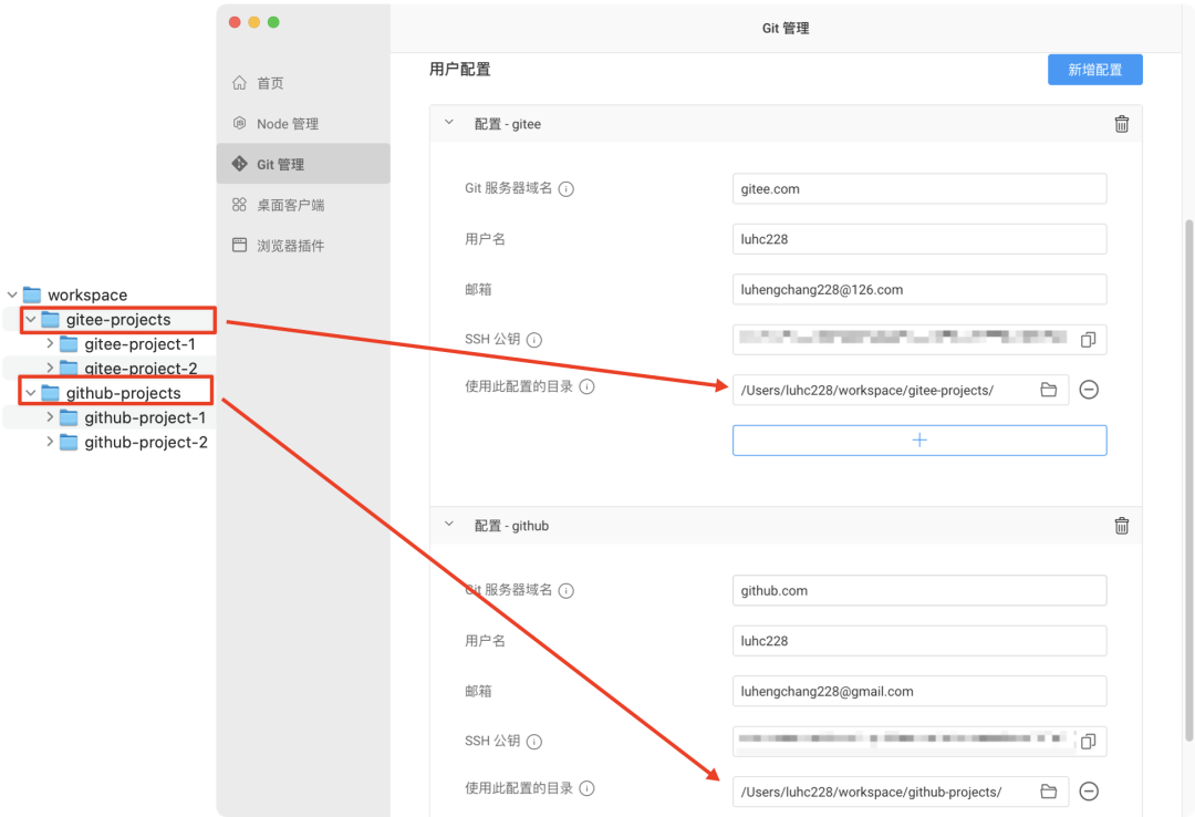 假设现在在 GitHub 和 Gitee 中开发项目,在 workspace 目录下有 gitub-projects 和 gitee-projects 两个目录用于存放 Git 项目。在 AppToolkit 中可快速新增对应 Git 配置,同时会自动为每份 Git 配置生成一份 SSH 密钥。添加 SSH 公钥到对应的代码托管平台后,便可 git clone 对应项目至对应目录下。之后的 Git 相关操作无需关注 Git 账号信息,Git 账号混用的问题也不会出现。