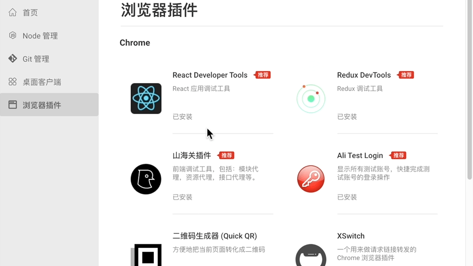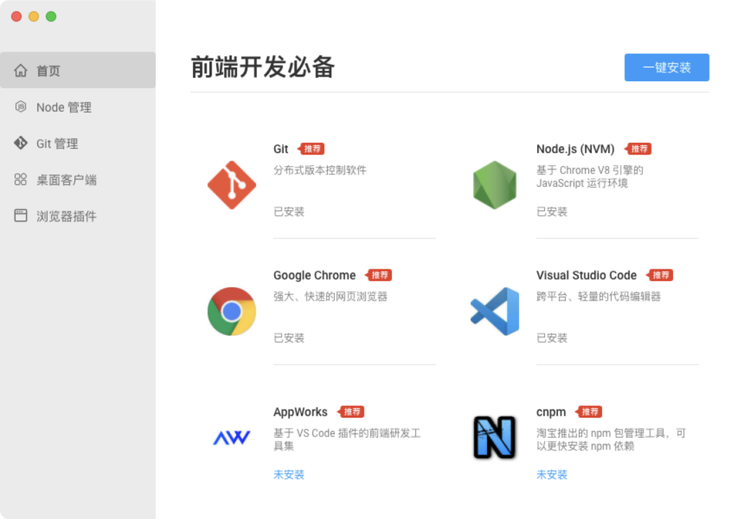 我们精选了常见且好用的前端开发工具,开发工具类别包括但不限定于浏览器、IDE、网络代理工具、接口调试工具、DevTools 等,在 AppToolkit 中可一键快速安装工具,大大减少查找和安装工具的时间。